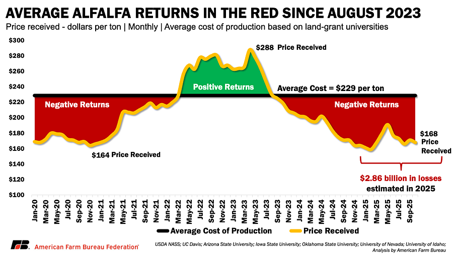 Those pressures are now reflected clearly in returns. Prices spiked during the drought-driven supply tightening of 2021–2022, but that rally reversed as weather conditions improved and export demand weakened. With prices now below full economic cost in many regions, losses have widened — and alfalfa is not eligible to receive to payments from the recently announced $11 billion Farmer Bridge Assistance Program, leaving the sector’s current shortfall unaddressed.