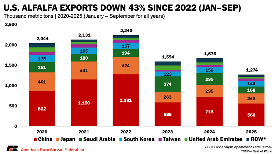 - Export demand has weakened sharply: Shipments to key markets, especially China, have fallen amid global dairy market shifts and ongoing trade conflicts, reducing a critical outlet for Western hay producers.