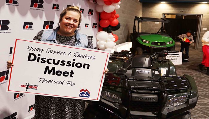 Laura Holmgren of Box Elder County won the 2023 Utah Farm Bureau Young Farmer and Rancher Discussion Meet. The competition was concluded at the recent Utah Farm Bureau Annual Convention in Provo and is considered a top honor for young farmers and ranchers in Utah.
