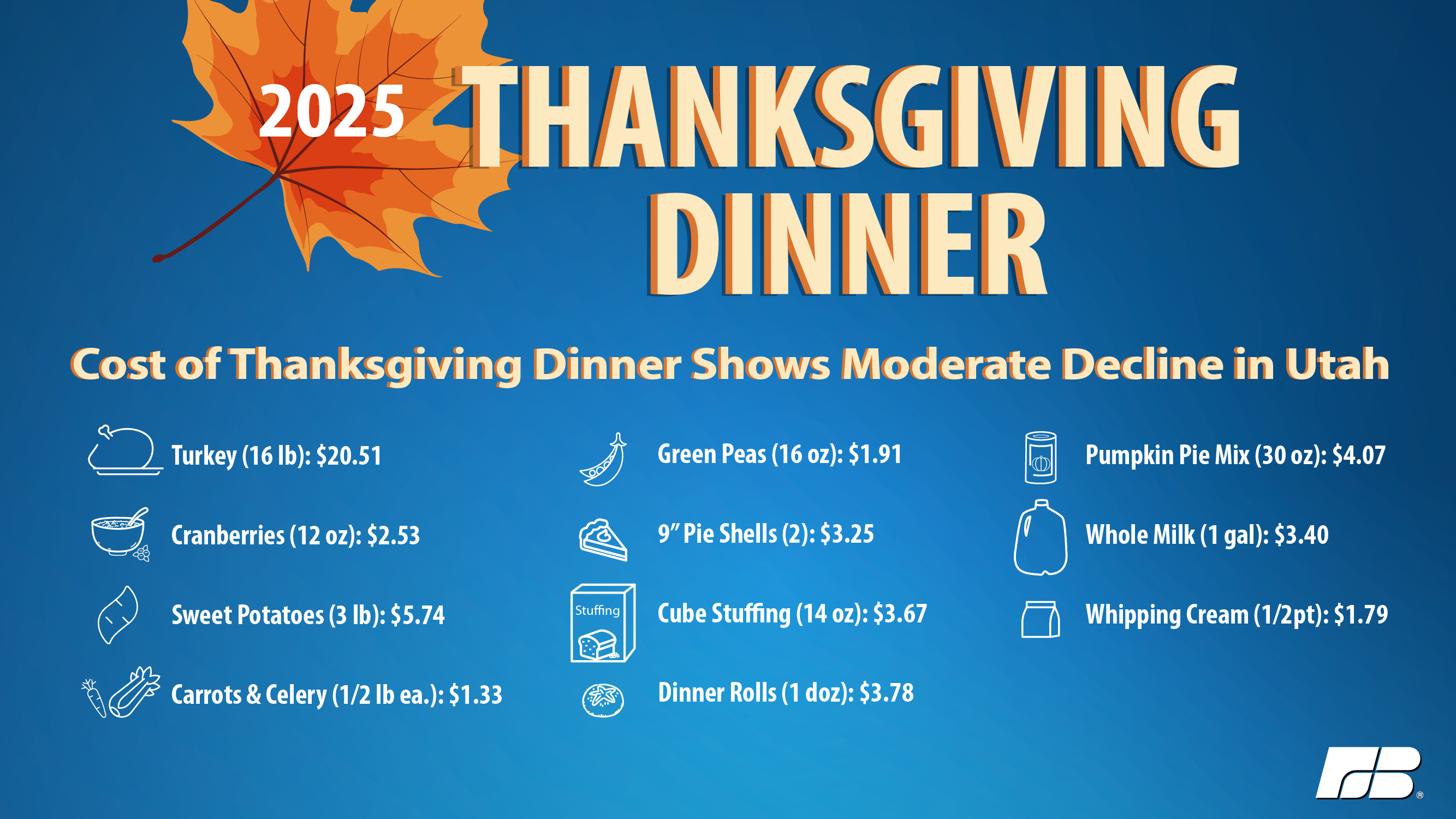Cooking a Thanksgiving dinner for your friends and family will cost less than last year, marking the third straight year of price declines. The American Farm Bureau Federation’s 40th annual Thanksgiving dinner survey provides a snapshot of the average cost of Thanksgiving staples that make up a classic holiday feast for 10, which is $55.18 or about $5.52 per person. In Utah, the overall average cost is a little more expensive than the national, due to higher prices for sweet potatoes. The average cost for a feast for 10 in Utah is $55.62, while the cost for a 16-lb. turkey is $20.51, about a dollar cheaper than the national average.