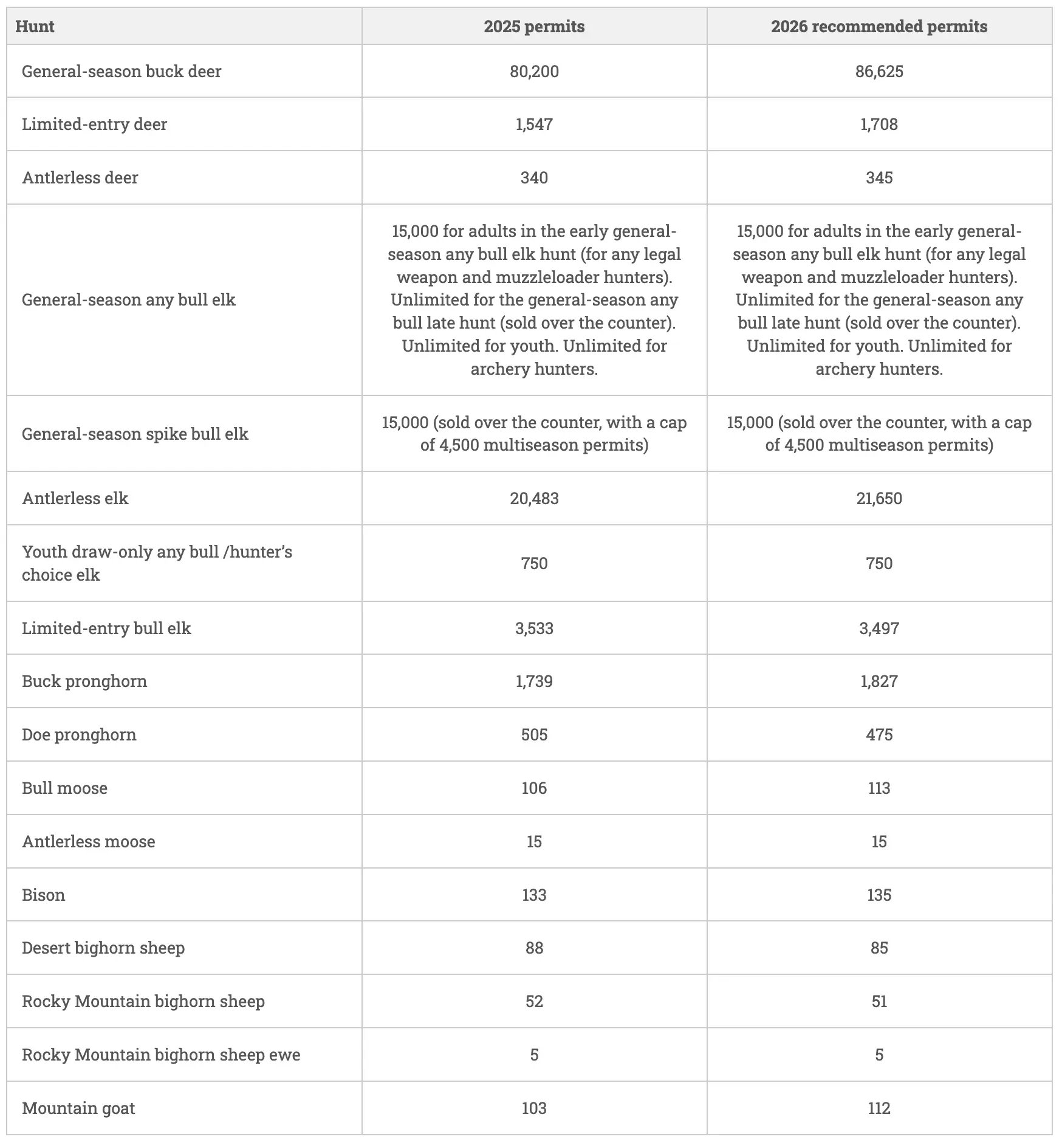 The table below shows the big game permit recommendations for 2026, including those for the deer, elk and pronghorn hunts, the once-in-a-lifetime hunts and the antlerless hunts: