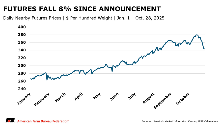 On Oct. 23, the administration announced it would increase the tariff rate quota for beef from Argentina in an attempt to lower consumer beef prices. Since 2020, about 2% of U.S. beef and veal imports have come from Argentina. Under the current tariff rate quota, Argentina can sell 20,000 metric tons of beef per year to the U.S. at a lower tariff. After the quota is met, the tariff increases. So far in 2025, about 30,000 metric tons of beef have been imported from Argentina, about 10,000 metric tons above the tariff rate quota and over 40% higher than last year. An increase to 80,000 metric tons would account for about 3.5% of the total U.S. beef import volume to date and about 0.6% of USDA’s forecasted U.S. beef consumption for 2025. This amount will not have a measurable impact on prices consumers pay for beef, but the announcement has already caused future prices for feeder cattle to fall by 7%.