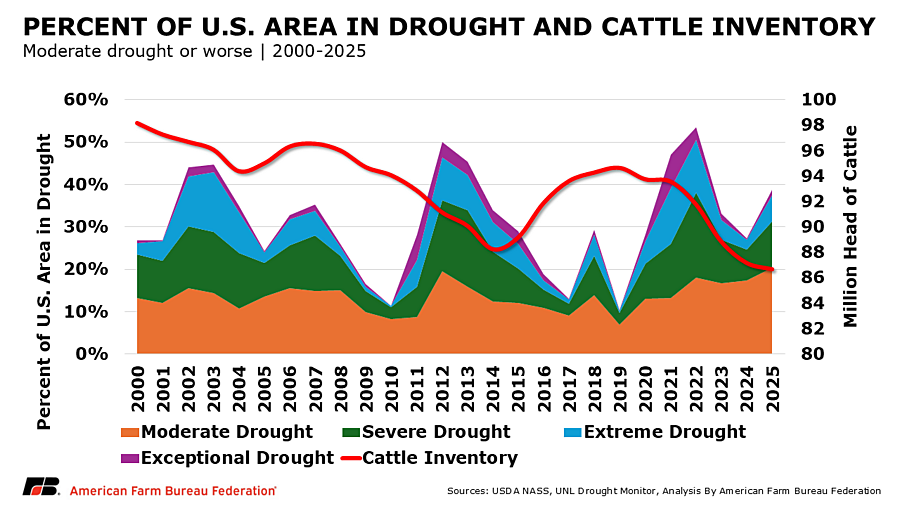 Rebuilding the cattle herd takes a long time. If a farmer decides today to keep a heifer instead of placing it on feed for market, it will take 30 months before that heifer produces a calf that creates meaningful growth in the cattle herd, putting us in 2028 before cattle supplies reflect that decision. However, if cattle prices fall and farmers can’t make a profit, they may market females, leading to fewer cattle supplies available for beef in the long run. For many ranchers, the past several years have included painful decisions. When ponds and springs dried up, some hauled water by the truckload just to keep animals alive a few more weeks. Others paid record prices to bring in hay from hundreds or even thousands of miles away, often spending more on freight than on the feed itself. Selling off breeding cattle wasn’t just an economic decision, it was an emotional one, representing years or even generations of herd development lost in a single season. Drought has forced families to part with genetics they had spent decades refining, knowing it could take years to recover what was sold in a matter of weeks.