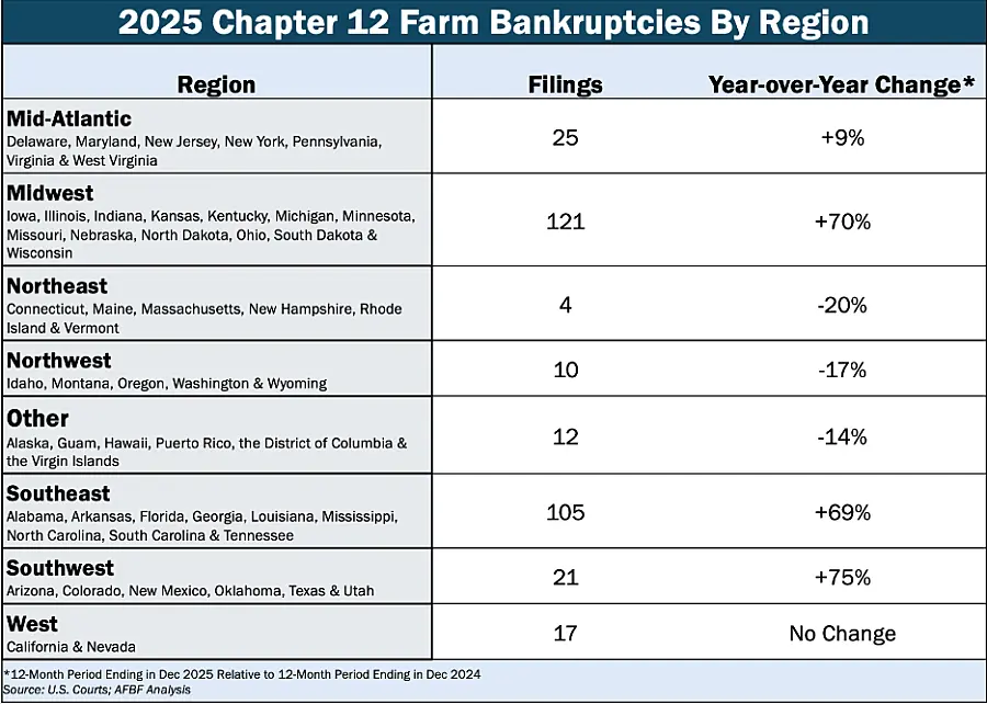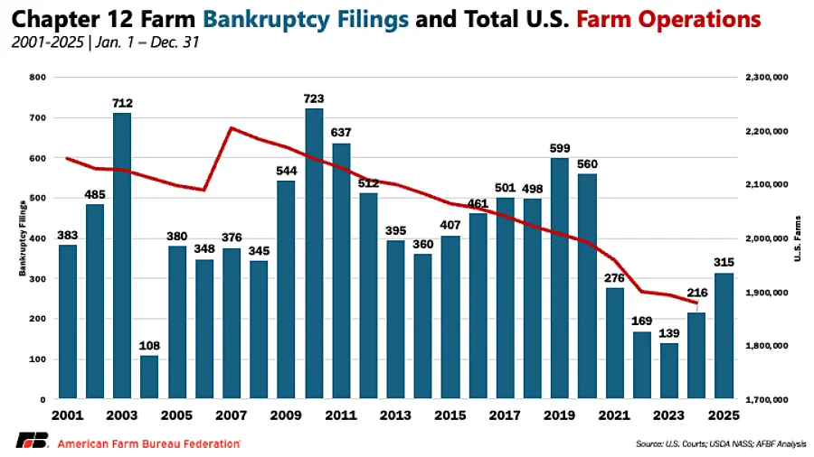 - Chapter 12 bankruptcies increased for the second year in a row, reaching 315 filings in 2025. This is a 46% increase from 2024.