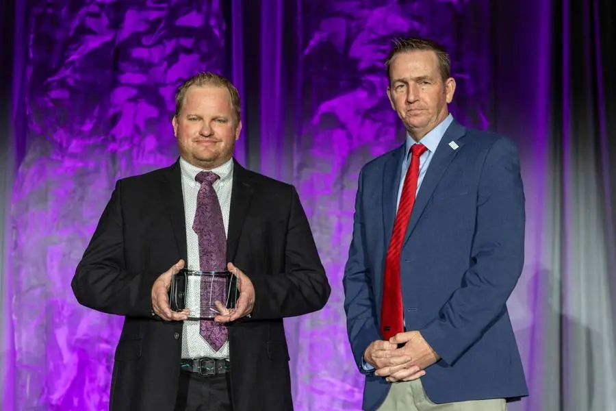 Chris Riley, left, is presented for graduation from the 12th PAL Class in Oregon. Joining him on the stage was Tyson Roberts, Utah Farm Bureau Vice President.