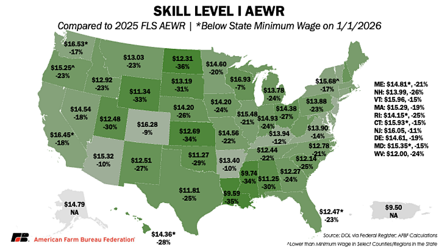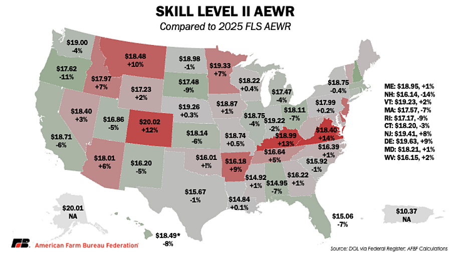 The adverse compensation adjustment would push the AEWR below the state minimum wage for eight states: Arizona, Colorado, Illinois, Maine, Maryland, Michigan, Nebraska and New Mexico. This puts domestic and H-2A workers back at the same wage, despite the compensation disparities DOL says exists between the groups. Even at the higher Skill Level II wages, seven states have AEWRs below the state minimum wage with the compensation adjustment (California, Connecticut, Florida, Hawaii, New York, Oregon and Washington), eradicating the efforts to allow higher compensation for higher skilled employees and level the payroll costs, and living expenses, of H-2A and domestic workers.