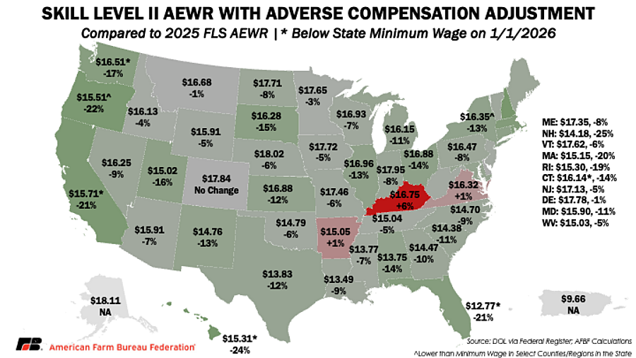 Employers may only deduct this adverse compensation adjustment from H-2A worker wages, not corresponding domestic workers, even if domestic workers live in employer-provided housing. All considered, domestic workers will receive the state minimum wage instead of the AEWR by Jan. 1, 2026, in eight states (California, Connecticut, Florida, Hawaii, Maine, Maryland, Rhode Island and Washington), and in two additional states, Oregon and New York, where it will apply only in more urban areas.