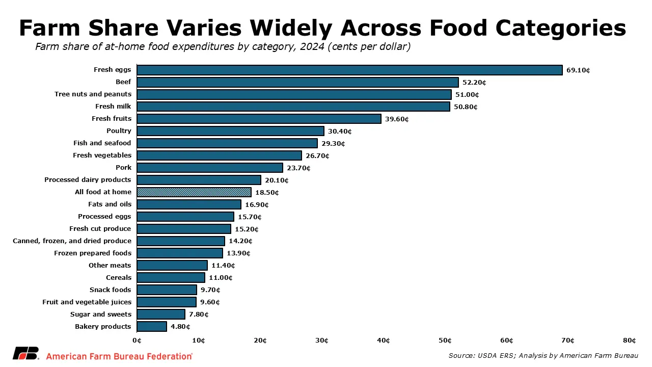 USDA’s Food Dollar data show that farmers receive a relatively small share of consumer food spending, and that share varies widely depending on the type of food purchased. In 2024, the farm share of the food-at-home dollar was 18.5 cents, up slightly from 18.4 cents in 2023, a 0.5% increase year over year. This means less than one-fifth of what consumers spend on groceries goes back to farmers.