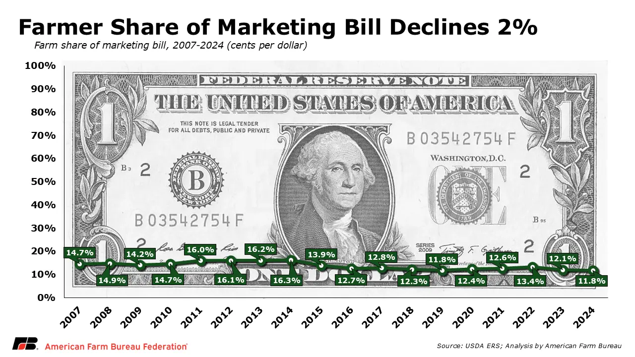 USDA’s Economic Research Service Food Dollar Series shows that the share of the consumer food dollar returning to farmers remains relatively small and continues to decline over time. In 2024, farmers received 11.8 cents of every dollar spent on domestically produced food, down from 12.1 cents in 2023, a 2.5% decrease year over year. The remaining 88.2 cents of the food dollar went toward the marketing bill, which includes costs associated with food processing, transportation, packaging, wholesaling, retailing and food service. The farmers’ share represents the portion of consumer spending tied directly to the value of raw agricultural commodities, while the marketing bill reflects the growing costs and value added beyond the farm gate. Over time, this shift illustrates how an increasing share of food spending is driven by services and supply chain activities rather than farm production itself.