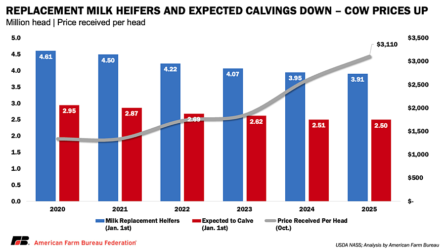 Notably, this contraction in replacements has persisted even as culling incentives have strengthened. October data show the price received for milk cows reached a record $3,110 per head, nearly $1,800 higher than just five years ago. Under normal conditions, prices at that level would be expected to accelerate culling, underscoring how unusually tight replacement availability has become.