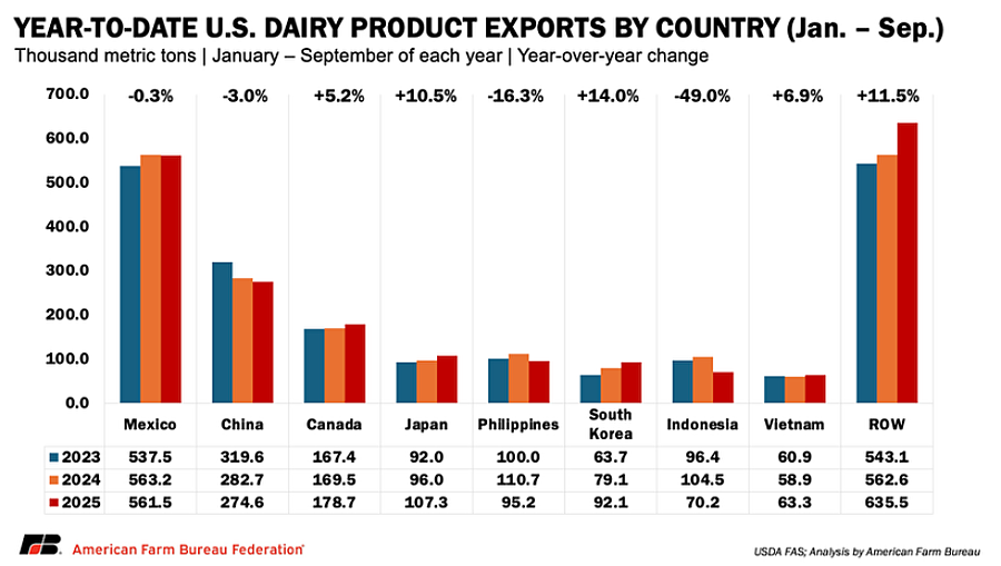 That pricing advantage has supported record U.S. dairy product exports in 2025, with shipments rising from approximately 2.02 million metric tons to 2.07 million metric tons between January and September, an increase of roughly 51,000 metric tons (2.4%) from to the same period in 2024. Even as exports to some major partners, including Mexico and China, softened, gains in Canada, Japan, South Korea, Vietnam and a growing number of smaller destination markets more than offset those declines, underscoring how broad-based price competitiveness is reshaping U.S. export flows.