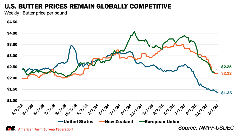 While these price declines have strained the milk side of dairy balance sheets, they have strengthened the competitive position of U.S. dairy products abroad. Since October, U.S. cheddar prices have averaged roughly 36% below New Zealand and 42% below the European Union, while U.S. butter prices have been even more discounted — about 73% lower than New Zealand and 68% lower than the EU.